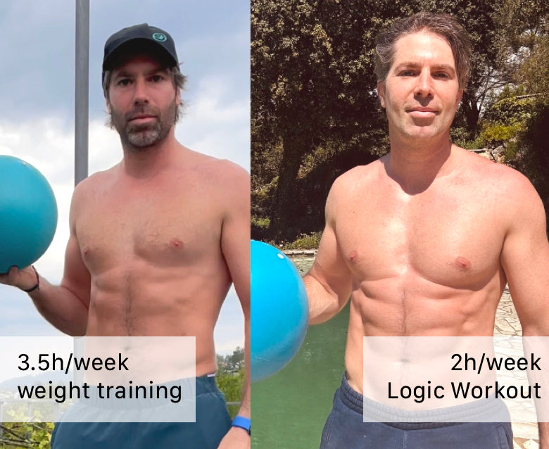 On the left, starting the Logic Workout app program after training for years with weights 3.5/week. On the right, 12 months later training just 2h/week with Logic Workrout.
